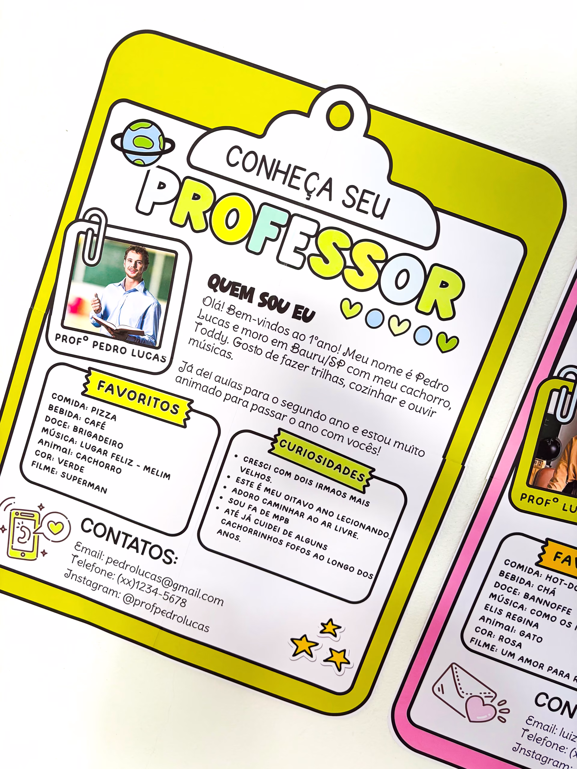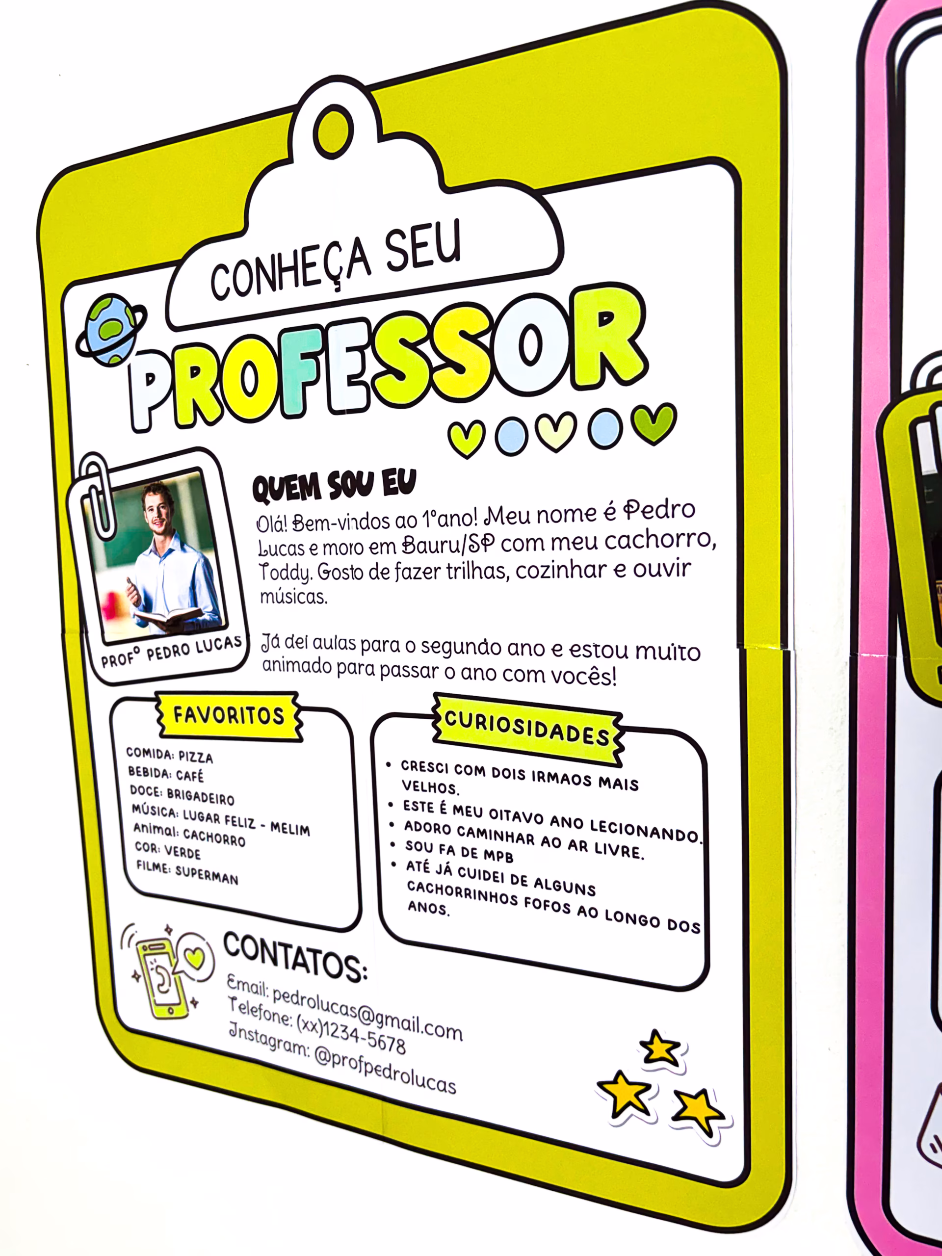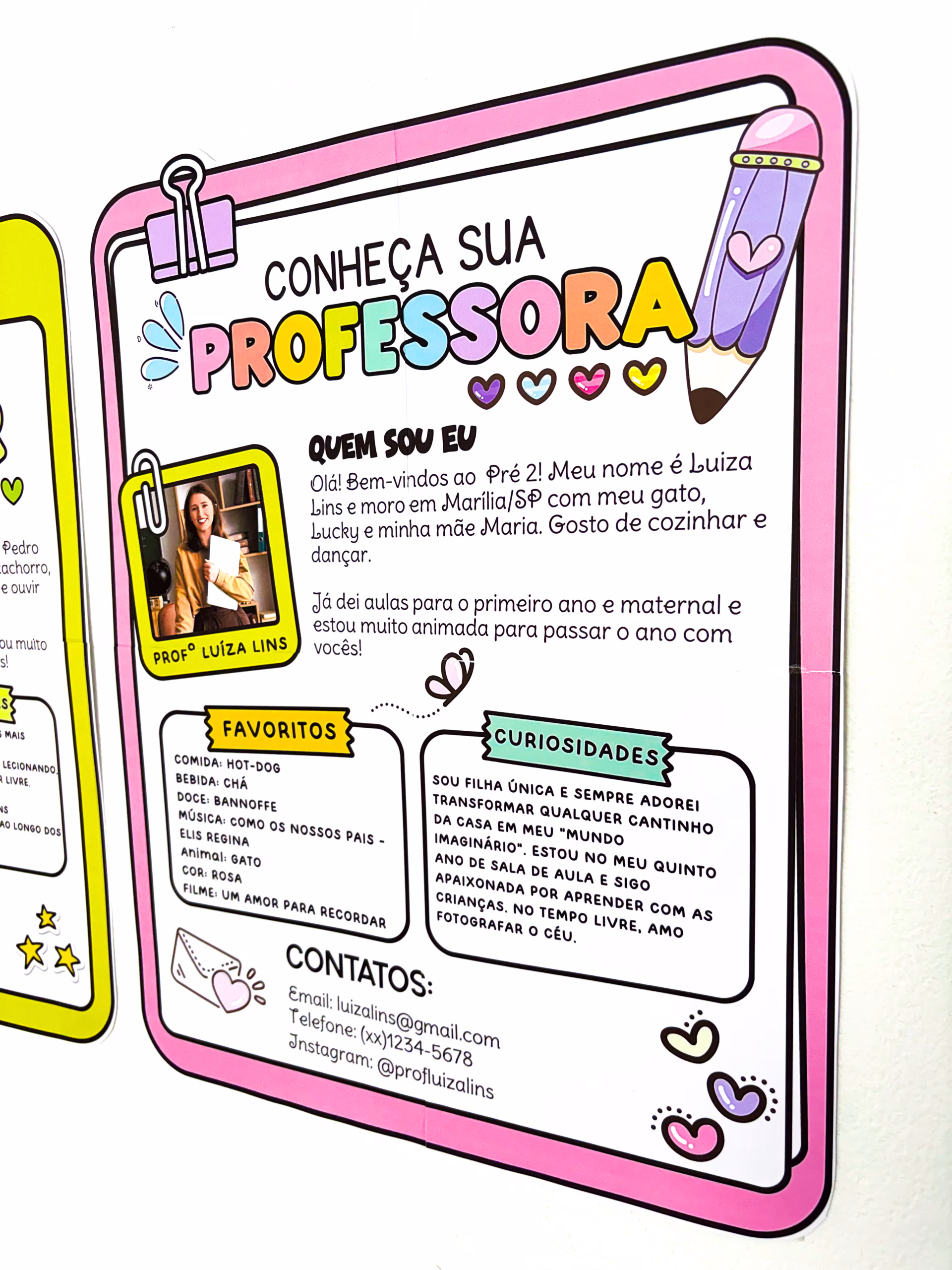 • ✅ É um cartaz em formato de prancheta, editável, com espaço para foto e texto de apresentação, disponível nas versões professor e professora.