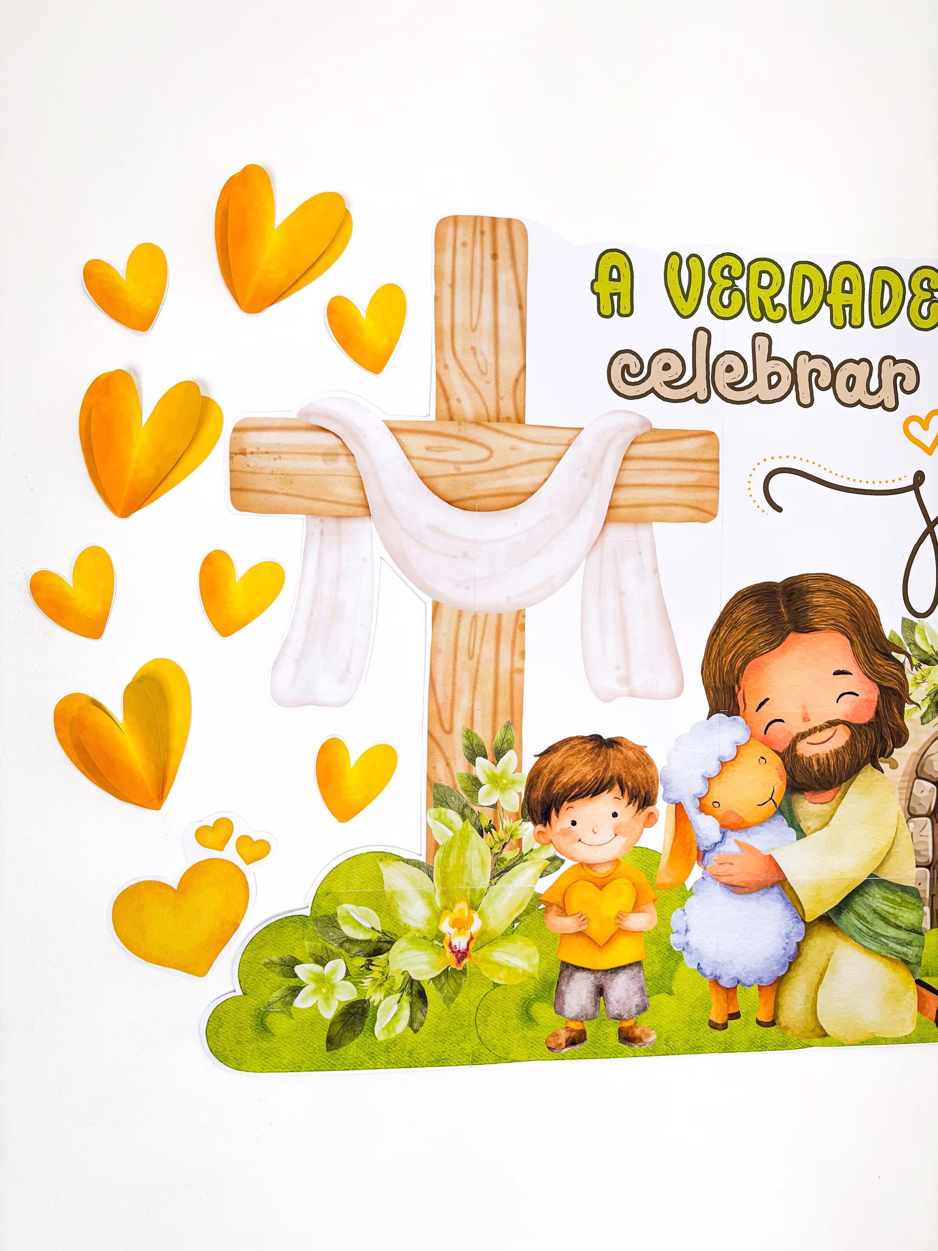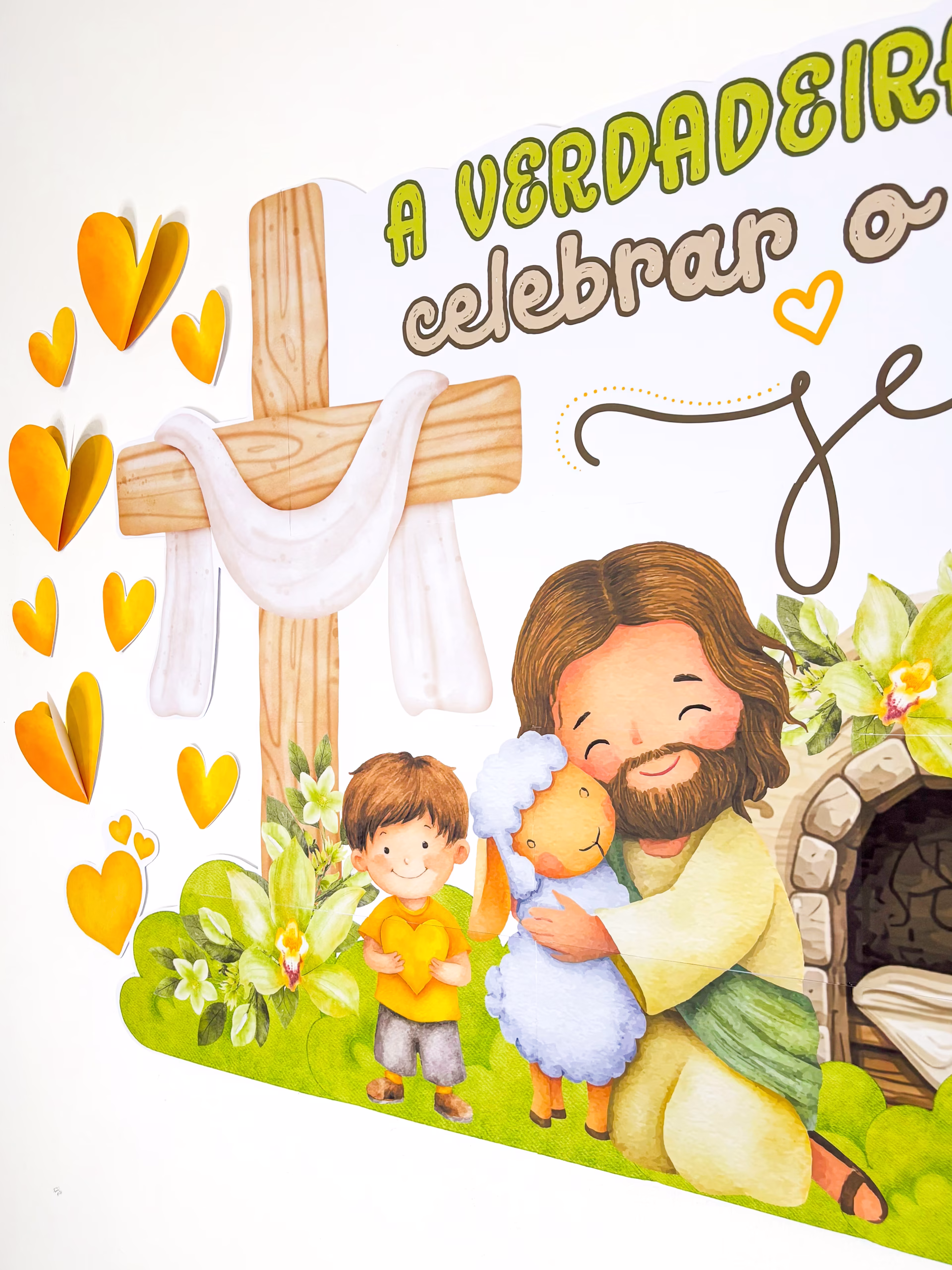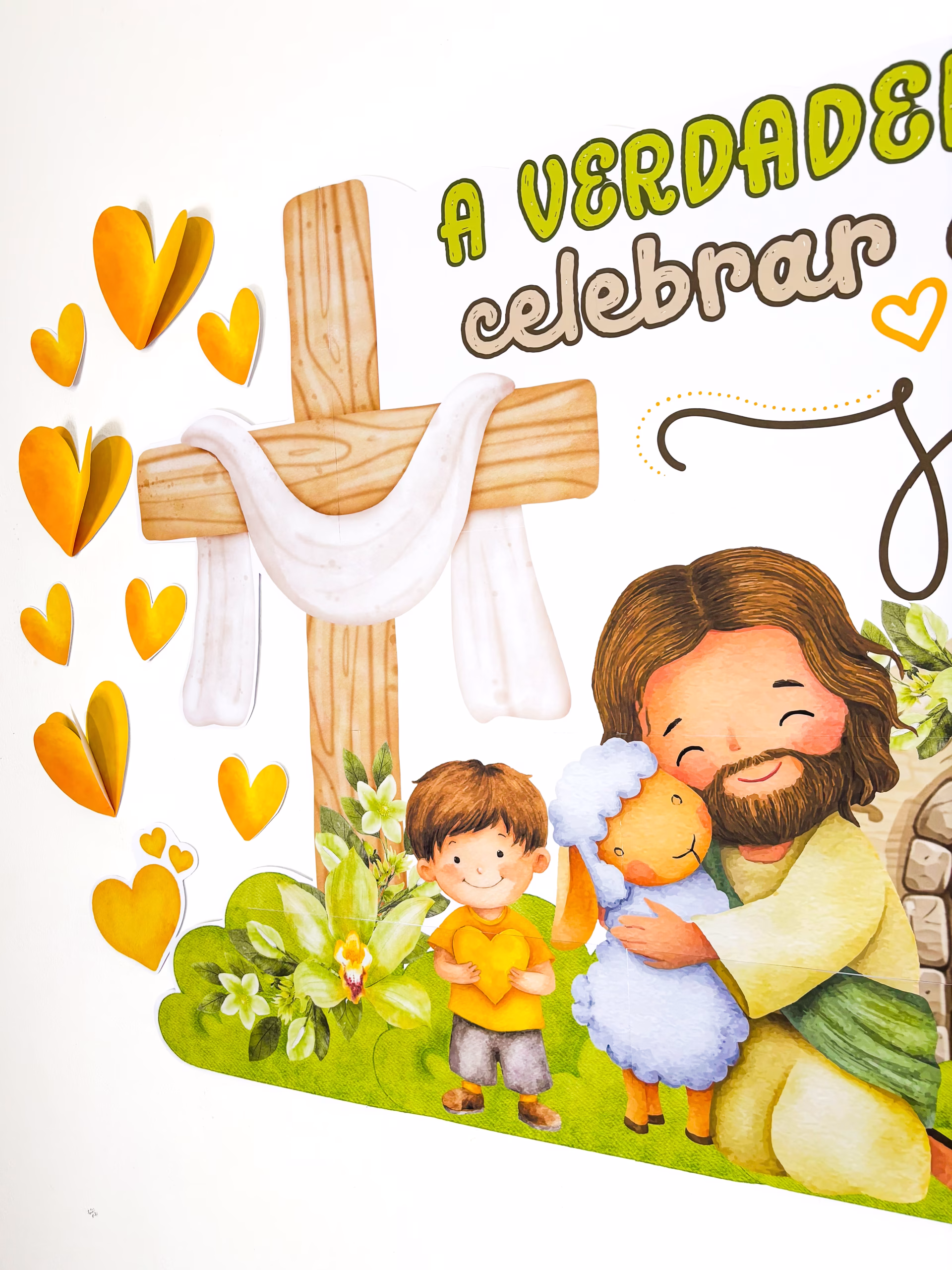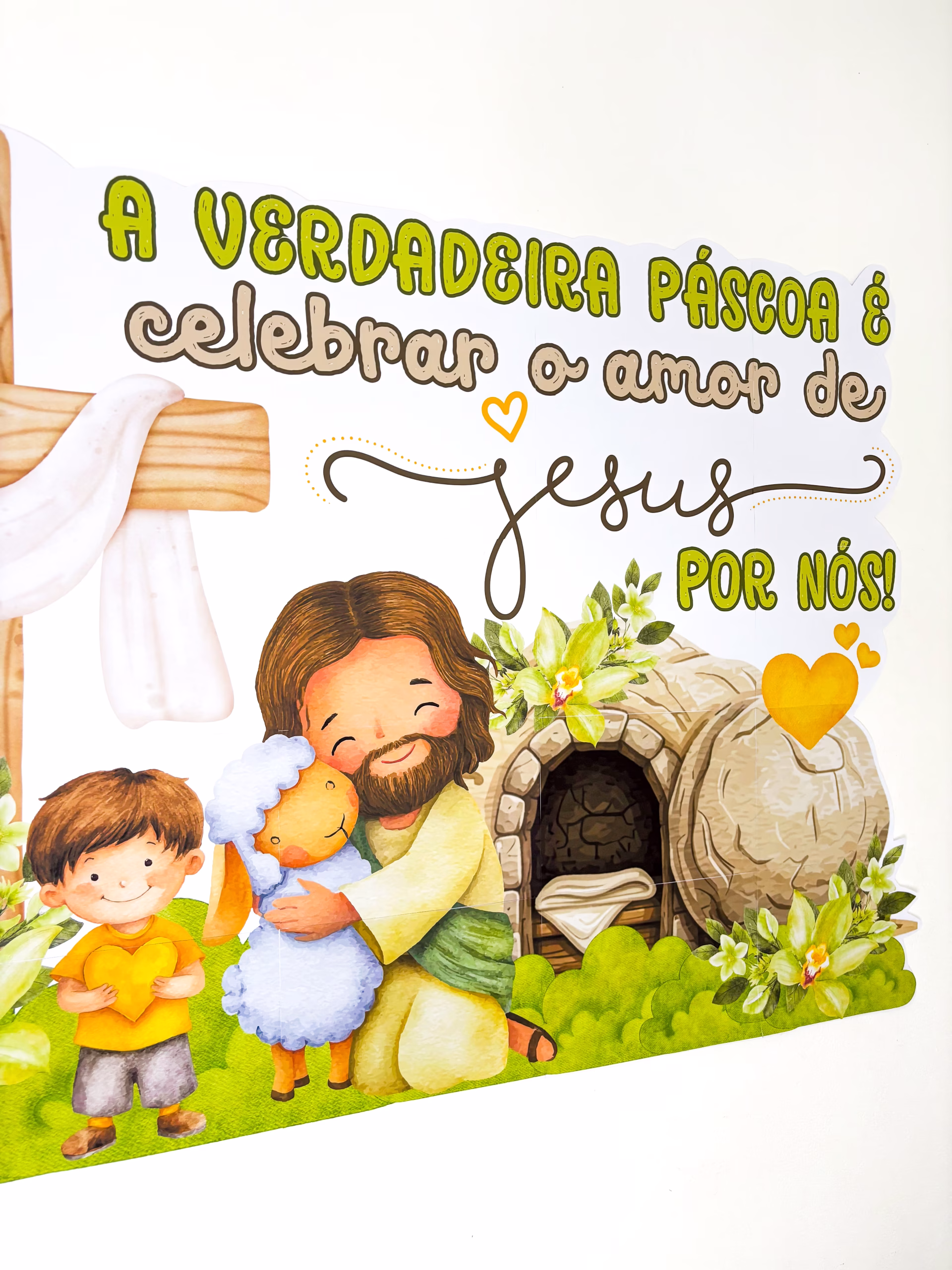 ✅ O painel traz elementos que ajudam a contar essa história de forma visual e sensível: a cruz, o túmulo vazio, Jesus com as crianças e detalhes delicados que remetem ao amor e à esperança da ressurreição.